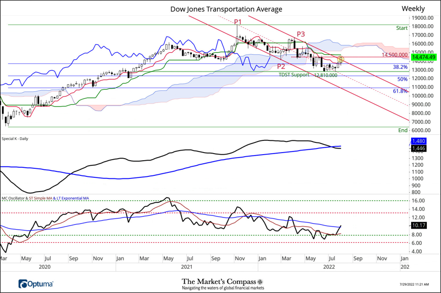 November 18 2022: Too early to tell but there is a potential Daily Momentum non-conformation of the price highs at P3 similar to the set-up at the August P1 high (see MC Transports Daily Momentum lower panel). A break of key support at the Kijun Plot (green line) and the Cloud at 13.650 would confirm that the turn from the P3 high was the start of a correction of a larger degree.